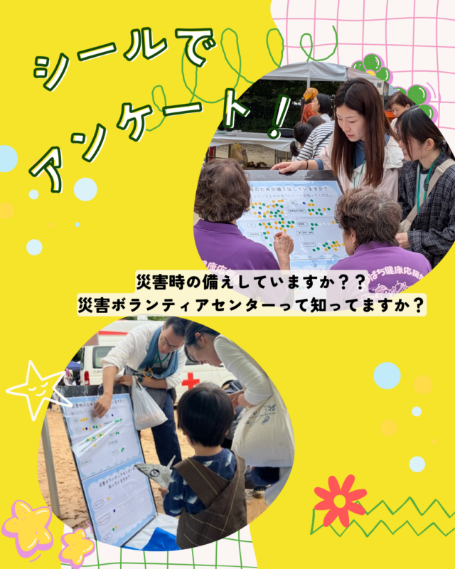 「シールアンケート」と「家具固定の啓発」「新聞紙でスリッパづくり」を実施し、50名近くの方に体験いただきました。ちょっとだけ紹介します!