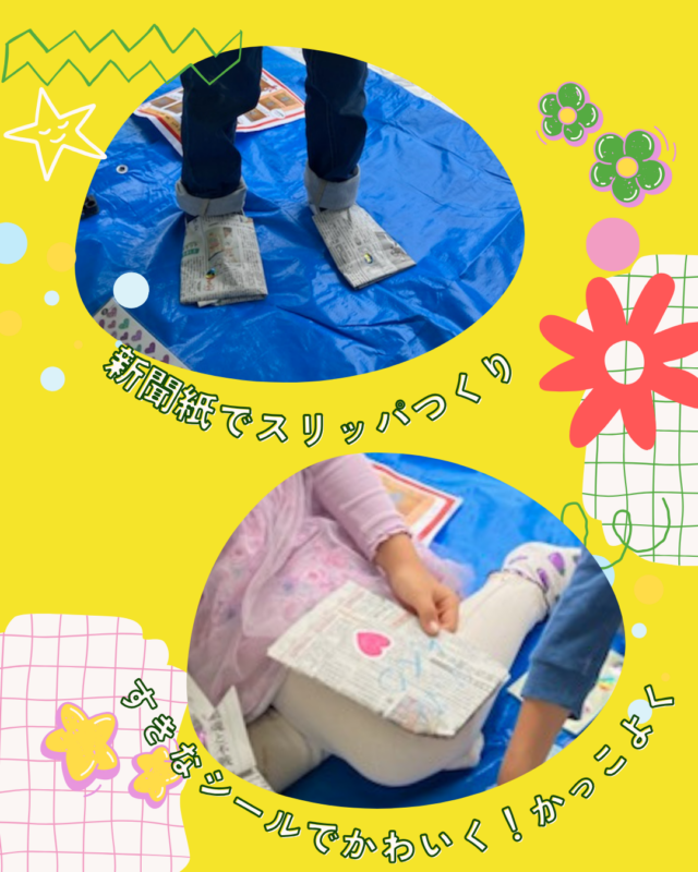 新聞紙でつくる簡易のスリッパ👟子どもたちも真剣に取り組んでくれました!