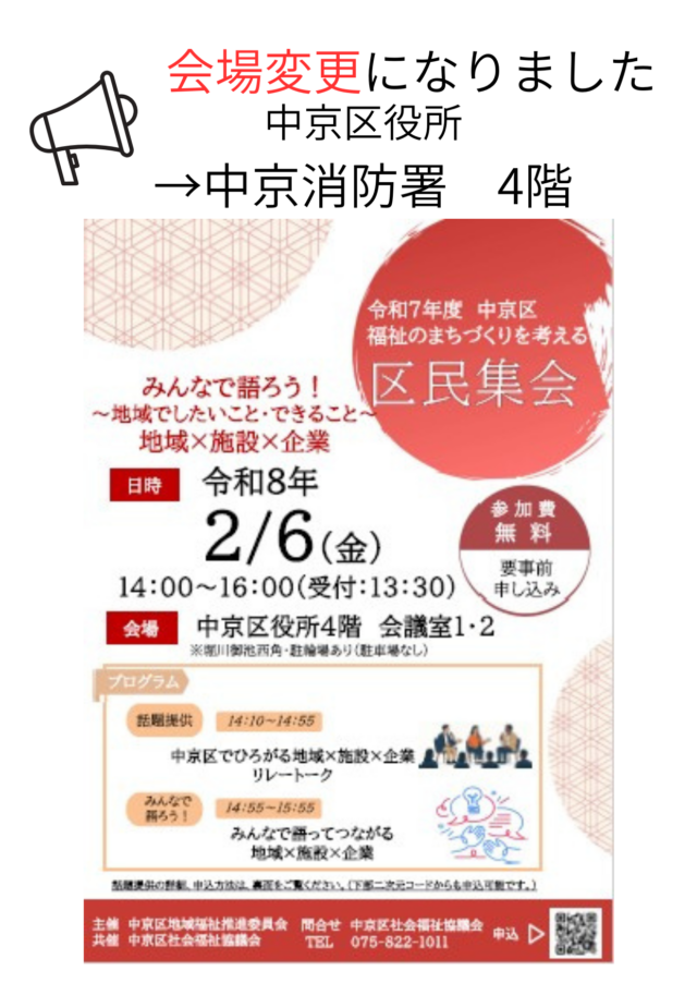 ご案内させていただいております、 2月6日(金)開催の令和7年度中京区福祉のまちづくりを考える区民集会の開催会場を 下記の通り変更いたしますのでご案内申し上げます。 中京区役所4階会議室1・2 → 中京消防署4階講堂 ※中京区役所4階より、館内通路で移動可能です ※開催時間は変更ございません ご参加いただくみなさま、 お間違えなきようお越しください。 ご参加を心よりお待ちいたしております。